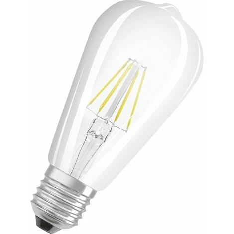 LED-Lampen, klassische Edison-Kolbenform. Produkteigenschaften: LED-Lampen für Netzspannung. Nicht dimmbar. Lebensdauer: bis zu 15.000 h. Ausstrahlungswinkel: bis zu 360°. Lampe aus Glas. Gute Lichtqualität, Farbwiedergabeindex Ra: ? 80, konstanter Farbort. Produktvorteile: Sehr geringer Energieverbrauch. Sofort 100 % Licht, keine Aufwärmzeit. Einfacher Austausch von StandardGlühbirnen. Lampen mit innovativer LED-Filament-Technologie. Anwendungsgebiete: Ideal für dekorative Einbauten. Anwendungen im Haushalt. Allgemeinbeleuchtung. Einsatz im Außenbereich nur in geeigneten Außenleuchten.Leuchtmitteltyp: LED FILFassung: E27Leistung: 6,5 WLichtleistung: 806 lmLichtfarbe: 2.700 K (warmweiß)Dimmbar: neinBauart: ST64Farbe: klarMaterial: GlasMaße: 14,3 x 6,4 cm (L x Ø)Abstrahlwinkel: bis zu 360°Lebensdauer: 15.000 hSchutzart: IP20Entspricht: Glühbirne 60 WTemperaturbereich: -20 bis +40°CSpannung: 220-240V, 50/60 HzLieferumfang: 1x Leuchtmittel